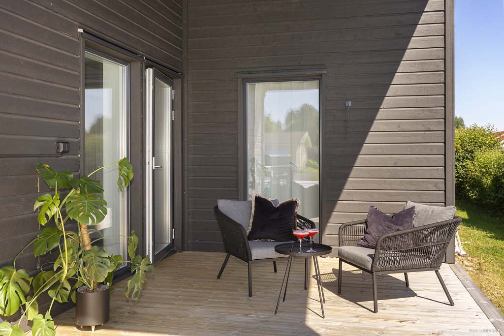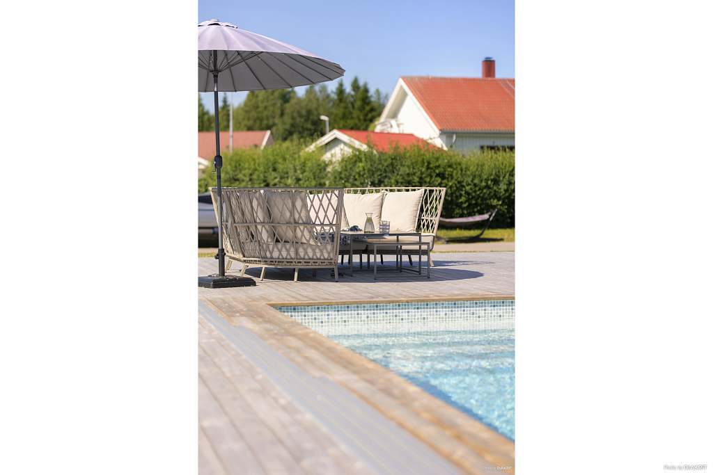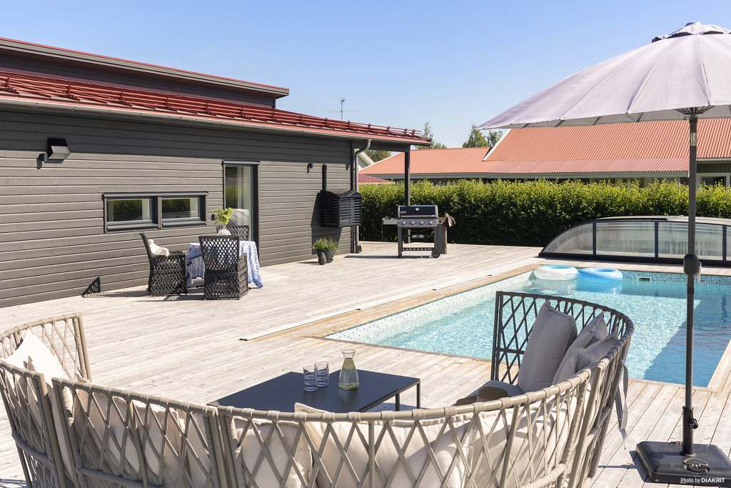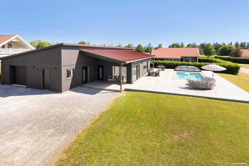 Nu har vi något utöver det vanliga! På en attraktiv hörntomt i ett stillsamt och barnvänligt kvarter på Sävastön ligger denna välplanerade enplansvilla med pool och genomgående hög standard. Här bor du med bekvämt avstånd till förskola, skola, mataffärer samt älven och golfbanan. Arkitekturen är stilren och tidlös, med materialval som är utvalda för att hålla över tid. Huset är ritat av Nordmark & Nordmark Arkitekter, något som tydligt märks i kvaliteten, detaljerna och helhetskänslan. När man kliver in möts man av en riktig WOW-känsla med öppna sociala ytor, generös takhöjd och ett fantastiskt ljusflöde. Köket från Kvänum är exklusivt utfört i vacker rökt ek med mörka detaljer och subtila guldinslag. Här finns påkostade vitvaror från Gaggenau, Miele och Siemens. Den rymliga matplatsen ligger i direkt anslutning till köket. Vidare in i huset finner vi ett stort vardagsrum, totalt fyra sovrum samt en praktisk klädkammare. Ett av sovrummen har separat entré och kan med fördel användas som exempelvis uthyrningsdel, kontor eller mottagning. Huset erbjuder två helkaklade badrum, varav ett är utrustat med en modern och lyxig bastu. Smart lösning med kombinerad bastu- och duschdörr i glas sparar utrymme. Här finns även en praktisk tvättstuga med vitvaror från Husqvarna, förvaringslösningar från Elfa och inredning från Marbodal. Samtliga ljuskällor i bostaden styrs smidigt via Plejd. Uppvärmning sker via fjärrvärme med vattenburen golvvärme i betongplatta samt effektiv FTX-ventilation. Luftvärmepump med AC från Daikin bidrar till ett behagligt inomhusklimat även under varma sommardagar. Bostaden erbjuder en modern och stilfull helhet där kvalitet präglar både materialval och utförande. Den genomtänkta arkitekturen möjliggör flexibla lösningar, både för den större familjen och för den som önskar kombinera boende med verksamhet. Den totala boytan om 138 m² kompletteras av 64 m² biarea, där ett integrerat garage ingår. Garaget har en extra bred och hög port från Crawford och är förberett för laddning av elbil. Den välskötta tomten om 904 m² erbjuder en stor altan och frodig gräsmatta. Här finns även en magisk pool från Poolkungen med gaveltrappa och LED-belysning. Poolen har ett extra högt pooltak i aluminium och värms via fjärrvärme, vilket gör det möjligt att bada även vid sämre väder. Utöver detta finns två rymliga altaner under tak - en med morgonsol och en med eftermiddagssol samt pooldäck i soligt söderläge. Tomten har ett högt och skyddat läge som ger en naturlig avskildhet från kvarteret. För den som önskar ytterligare integritet finns möjlighet att komplettera med häck eller ett stilrent räcke med glaspartier runt altanen, vilket ytterligare förstärker den privata känslan. Detta är ett mycket påkostat och väl omhändertaget hem för dig som söker något utöver det vanliga. Välkommen att anmäla ditt intresse!Läs mer